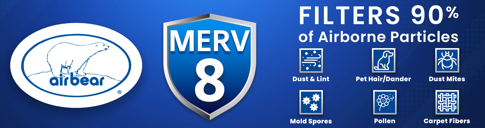 Selecting the right MERV 8 air filter helps maintain cleaner air while keeping your HVAC system running smoothly. Whether you’re upgrading your home’s air quality or maintaining a commercial system, Air Bear MERV 8 filters provide dependable, cost-effective filtration. All Air Bear filters are available in MERV 8, find your size today and we'll ship it to you for free! Have an Air Bear cabinet in your home HVAC system? Use our handy guide to find your correct size.