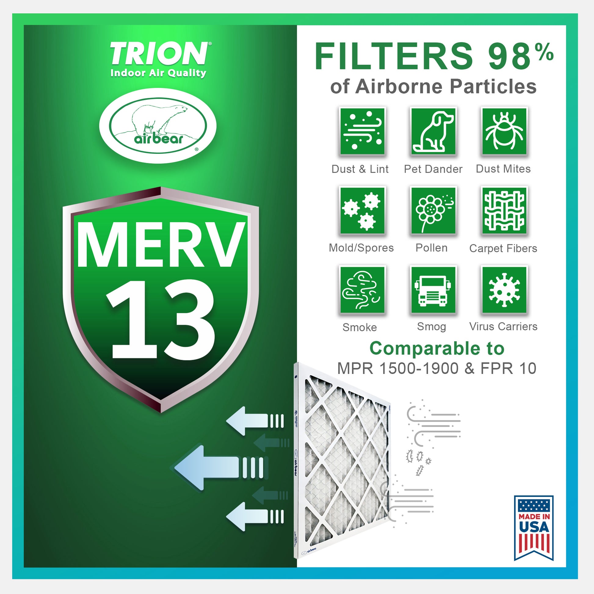 • High quality construction (made in the USA) features an electrostatically charged designed filter media that captures more harmful particles and lasts 3x longer than fiberglass models (replace every 90 days for best performance)